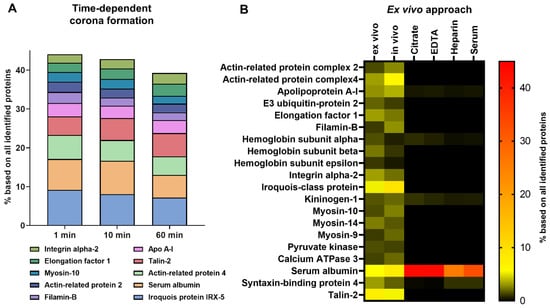 In vivo protein corona formation occurs rapidly and does not change significantly over time. (A) The protein corona composition in vivo was compared for three different time points (1 min, 10 min or 1 h). The average amount of each protein in % is shown (n = 3–5). The 10 most abundant proteins contribute to ~50 % and indicate no significant difference in their relative abundance over time. (B) To mimic in vivo corona formation, nanoparticles were incubated directly in blood (ex vivo) for 1 min. The heat map of the 20 most abundant corona proteins highlights the similarity between the ex vivo and in vivo corona after 1 min of blood circulation. The average amount of each protein in % is shown and calculated from technical triplicates and biological replicates for ex vivo (n = 2) and in vivo (n = 5). For comparison, nanoparticles were incubated with serum or plasma for 1 min. All identified proteins are summarized in a separate Excel sheet.