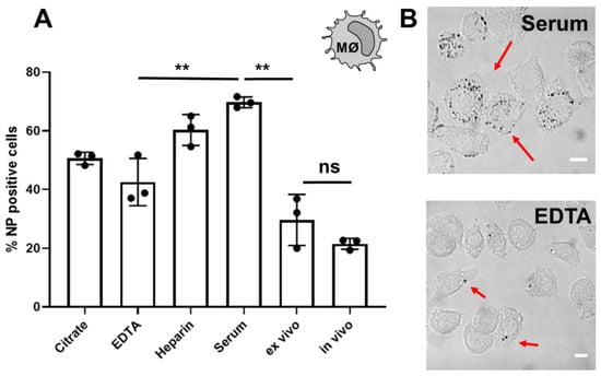 Cellular interaction of protein corona coated nanoparticles depends on the anticoagulant and differs for nanoparticles recovered from the blood stream (in vivo) (A) Nanoparticles were incubated with serum, plasma, blood or isolated after in vivo administration. Protein corona coated nanoparticles were subsequently added to macrophages (RAW264.7) for 2 h at a concentration of 75 µg/mL. Cellular association was analysed via flow cytometry. The amount of nanoparticle (NP) positive cells in % is shown. (B) Representative images illustrate the intracellular distribution of the nanoparticles. RAW264.7 cells were treated with serum or citrate plasma coated nanoparticles for 2 h at a concentration of 75 µg/mL. Scale bar: 10 µm. For statistical analysis, a student’s t-test (two-tailed, unpaired) was performed comparing EDTA versus serum, serum versus ex vivo and ex vivo versus in vivo incubated mgHES nanoparticle. ns = not significant, ** p < 0.01 (n = 3).