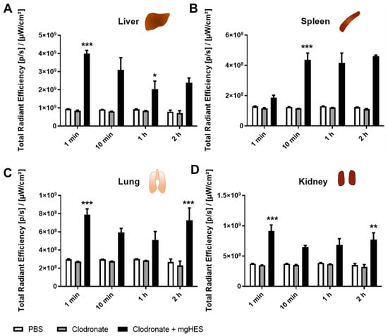 The biodistribution of the mgHES nanoparticles into different organs over time. (A–D) Animals were treated with PBS, clodronate-liposomes or mgHES nanoparticles (1 mg). Organs were isolated and imaged with IVIS®. The fluorescent intensity of all organs was analysed over time 1 min–2 h. (A) = Liver, (B) = Spleen, (C) = Lung, (D) = Kidney. For statistical analysis, a two-way ANOVA test was performed comparing PBS versus mgHES nanoparticle treated animals * p < 0.05, ** p < 0.01, *** p < 0.001 (n = 3–5).