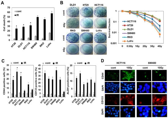 Experimental and clinical data show that CSCs play an important role in tumor recurrence and resistance to therapy [7,8,9]. To investigate the relationship between radiation resistance and population of CSCs, we first confirmed the radiation resistance in various types of colorectal cancer cells, including in previously reported radioresistant and radiosensitive cells [17]. Colorectal cancer cells such as HCT116, DLD1, and HT29 were relatively resistant to radiation by annexin V/PI staining and colony formation assay. (Figure 1A,B); however, the expression of colorectal CSC markers such as CD44, CD133, and ALDH was similar to that of radiosensitive colorectal cancer cells under untreated conditions (Figure 1C). Next, we examined the effect of radiation on the expression of colorectal CSC markers. Flow cytometry and immunocytochemistry analysis (Figure 1C,D) showed that radiation increased the expression of CD133 and ALDH in all colorectal cancer cells except LoVo cells with unchanged expression of CD133, whereas CD44 expression was selectively increased in radioresistant colorectal cancer cells such as HCT116, DLD1, and HT29 (Figure 1C). These results suggested that resistance to radiation in radioresistant colorectal cancer cells may be acquired by radiation-upregulated expression of CD44, which is one of the markers of colorectal CSCs.