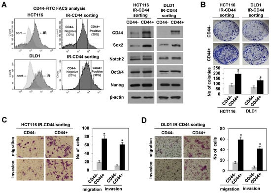 CD44+ cells induced by radiation exhibited the properties of cancer stem-like cells (CSCs) with an increase in SOX2 levels. (A) CD44+ CD44− cells on day 2 after irradiation with 10 Gy in radioresistant colorectal cancer cells (HCT116 and DLD1) were sorted (left panel). Immunoblotting for the expression of CSC-related proteins in CD44+ (positive) and CD44− (negative) in radioresistant cells (right panel). (B) Colony formation assay was performed with CD44+ (or CD44−) cells, and the bar graphs show the quantification of relative colony numbers in indicated cells. Data are shown as mean ± SD (n = 3) * p < 0.05 compared to control. (C,D) The migration and invasion analysis (left panel) and quantification of cells involved in migration and invasion (right panel) in CD44+ and CD44− cells sorted from HCT116 and DLD1 cells, respectively. All experiments were performed in triplicates. Data are shown as mean ± SD. * p < 0.05 compared to CD44− cell. CD44−: negative, CD44+: positive, CSCs: cancer stem-like cells.