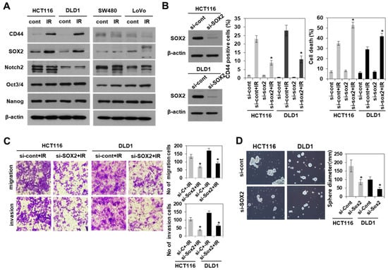 To delineate the role of radiation-induced CD44 expression in radioresistant colorectal cancer cells, we isolated both CD44 positive (CD44+) and negative (CD44−) cells in HCT116 and DLD1 cells following irradiation using anti-CD44-FITC antibodies by FACS, and the expression of CD44 in both CD44+ and CD44− cells is shown in Figure 2A. Since the CD44 marker correlated with the features of CSCs in colorectal cancers [19,20], we evaluated the properties of colorectal CSCs including metastatic potential and self-renewal. We observed an increase in colony formation, migration and invasion in the sorted CD44+ cells after irradiation and not in CD44− cells in both cell lines (Figure 2B–D). Interestingly, immunoblotting of stemness-related proteins revealed significant elevation in SOX2 levels among stemness-related proteins [21,22] on sorted CD44+ cells (Figure 2A). Given the evidence that SOX2 was aberrantly expressed and involved in the maintenance of CSCs in colorectal cancer [14,15], these results indicated the possibility of a functional relationship between SOX2 expression and CD44-mediated CSC property in radioresistant cells upon radiation exposure.