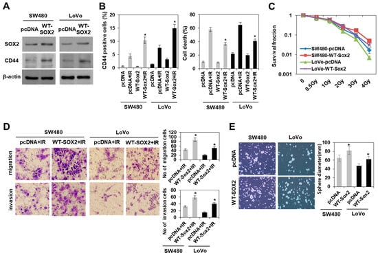 We further determined whether the expression of either CD44 or SOX2 in response to radiation is dependent on radioresistant colorectal cancer cells. These proteins were upregulated by irradiation in radioresistant, but not radiosensitive colorectal cancer cells (Figure 3A). To further clarify the role of radiation induced SOX2 in regulating colorectal CSCs, we examined the effect of SOX2 siRNA on the properties of CSCs in both HCT116 and DLD1 cells. Immunoblotting analysis in Figure 3B showed the efficient knockdown of SOX2 expression in both cells with SOX2 siRNA treatment. In addition, the knockdown of SOX2 attenuated the radiation-induced properties of CSCs, including the enhanced ability to migrate, invade, and form tumourspheres, and reduced CD44+ population growth (Figure 3B–D). Next, we examined the effects of SOX2 overexpression. Upon irradiation, the overexpression of SOX2 facilitated the acquisition of the properties of colorectal CSCs in radiosensitive colorectal cancer cells (SW480 and LoVo) due to an increase in CD44+ population, cell survival, migration, invasion, and tumoursphere-formation (Figure 4). Taken together, these results suggested that SOX2 regulated population growth and properties of CSCs in colorectal cancer following irradiation, and SOX2 may be a potential target for studies involving resistance to radiation.