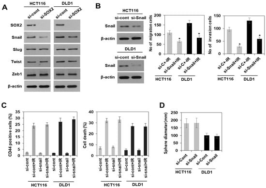 Next, the potential molecular mechanism involved in the SOX2-dependent induction of colorectal CSCs following irradiation was elucidated. The phenomenon of epithelial-mesenchymal transition (EMT) has emerged as a feature of CSCs in recent times [6,23]. In addition, expression levels of the master regulator of EMT such as Snail and Zeb1/2 were modulated by SOX2 protein level [24,25]. Therefore, we investigated whether EMT is associated with SOX2-dependent induction of colorectal CSCs. Immunoblotting analysis showed that among EMT-associated proteins, Snail expression was decreased in SOX2 siRNA-transfected HCT116 and DLD1 cells (Figure 5A). In addition, we found that knockdown of Snail dramatically suppressed the ability of migration and invasion, a hallmark of EMT (Figure 5B). However, Snail did not affect the induction of properties of colorectal CSCs including CD44+ population growth, resistance to radiation, and ability of tumoursphere formation (Figure 5C,D), suggesting that the Snail-mediated EMT process might not be involved in SOX2-dependent induction of colorectal CSCs upon irradiation.