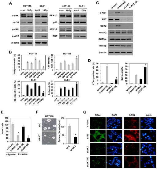 Since SOX2 expression is important for inducing the characteristics of CSCs as observed in our study and from previous reports [14,15], we attempted to identify the upstream regulator of SOX2. To do so, we investigated the activation of mitogen-activated protein kinase (MAPK) and phosphatidylinositol 3-kinase (PI3K)/AKT pathways, known to regulate SOX2 under other conditions [26,27,28,29]. With western blotting, we found that radiation activated both MAPK and PI3K/AKT pathways except ERK activation (Figure 6A). Treatment with the pharmacological inhibitor of PI3K/AKT pathway (LY294002), but not the inhibitors of ERK (PD98059), p38 (SB203580), and SAPK/JNK (SP600125) pathways, dramatically suppressed radiation induced CD44 expression, which is a marker of colorectal CSCs and radioresistance in HCT116 and DLD1 cells (Figure 6B). The concentrations of the inhibitors used were referenced to previous studies, including our report [30]. Based on AKT silencing, we further confirmed the function of PI3K/AKT as an upstream regulator of SOX2-dependent induction of colorectal CSCs by observation of the reduced expression of SOX2 and CD44, as well as CSC properties, such as radioresistance, in vitro metastatic potential, and tumoursphere formation (Figure 6C–E). Moreover, immunocytochemistry further supported the AKT-dependent expression of both CD44 and SOX2 in irradiated HCT116 cells with or without AKT siRNA (Figure 6G). Collectively, these results suggested that radiation enhanced PI3K/AKT/SOX2 axis promoted the induction of colorectal CSCs in radioresistant colorectal cancer cells.