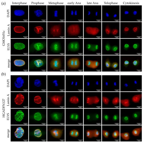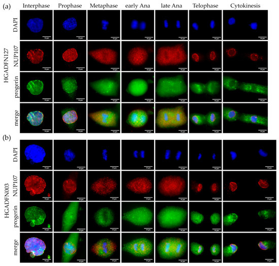 NUP153 is one of the first members to be recruited to early anaphase chromosomes, following ELYS and the NUP107-160 complex [18,19,20], and its recruitment occurs before LB1 and LA [23,35]. Therefore, we examined NUP153 localization throughout mitosis in comparison to NUP107 in both HGPS and control cells, to rule out a potential defect in NPC basket assembly (Figure 4 and Figure S2).