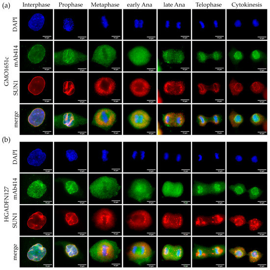 Consequently, we performed double labeling of either SUN1 (Figure 5 and Figure S3) or POM121 (Figure 6 and Figure S4) with mAb414 antibody recognizing NUP62, NUP153, NUP358, and NUP214 [37,38]. We expected mAb414 to be recruited after POM121 and to collect around the chromosomes in a more diffuse pattern.
