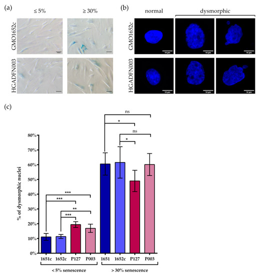 In a recent study, we examined the similarities in cellular aging between HGPS and control cells [39]. We have shown that progerin accumulates in senescing cells during long-term culture [39]. As HGPS cells senesce at earlier passage numbers than control cells [39], we investigated control and HGPS cultures at senescence (SNS) index of ≤5% and ≥30%, defined by the number of cells positive for senescence associated β-Galactosidase (SA-β-Gal) (Figure 7a). By comparing control and HGPS cultures exhibiting a similar SNS index, we classified and determined the percentage of nuclei with normal ovoid nuclear shape and those presenting abnormal and large morphologies, considered dysmorphic (Figure 7b). Young HGPS cultures (≤5% SNS) contained significantly higher numbers of dysmorphic nuclei (~18%) than their control counterparts (~11%) (Figure 7c). However, in older cultures (≥30% SNS) the presence of dysmorphic nuclei in control and in HGPS cultures was relatively similar (Figure 7c). The number of dysmorphic nuclei increased three-fold (~58%), in all four-primary fibroblast strains analyzed during replicative senescence (Figure 7c).