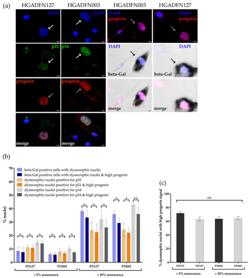 Cells with high levels of progerin were senescent. (a) Representative images of cells stained for α-progerin and α-p16/p21 or β-Gal, counterstained with DAPI. Arrows indicate nuclei with a high progerin signal and positive for either high p16 or p21 or beta-Gal. (b) The number of dysmorphic nuclei with strong progerin signal positive for SA-β-Gal and positive for p16 or p21 increased during replicative senescence. (c) The number of dysmorphic nuclei with strong progerin signal remained constant during replicative senescence. At 5% senescence, HGPS cells had a passage number ≤ P18 and at 30% senescence ≥ P21. Values are presented as mean ± SD (n ≥ 3), not significant (ns) p > 0.05, * p < 0.05, ** p < 0.01, (b,c) unpaired t-test, (c) one-way ANOVA with Tukey’s multiple comparison test.