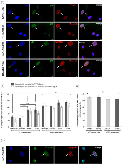 As clustering of NPCs occurred mostly in interphase dysmorphic nuclei with blebs or folds, we evaluated the statistics of this phenomenon and determined, if these dysmorphic cells were senescent. As SA-β-Gal staining was not compatible with the immunofluorescence detection of NPCs, we used p16 staining of dysmorphic nuclei. We used p16 in combination with the transmembrane NUP POM121 to investigate the relationship between senescence, NPC clustering, and progerin (Figure 10a). In dysmorphic nuclei, POM121 was clustered in the NE folds in both control and HGPS cells (Figure 10a, white arrows). These p16 positive nuclei were frequently enlarged, presenting a DNA-DAPI signal less intense than normal ovoid nuclei (Figure 10a).