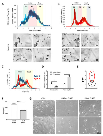 Celector® sorting profiles of hAFSC samples. hAFSCs populations showed two types of profiles. Type (A) samples were divided into 3 fractions (F1, F2 and F3) while type (B) in 4 fractions (F1, F2, F3 and F4). Representative images and magnifications of eluting cells during time of analysis are shown below each profile. (C) The overlay of the two graphs are shown. In this graph is shown the division in initial and final eluate that was made to simplify all readouts. (D) The column graph shows the relative normalized area under each part of the Celector® profile curve (Initial eluate = F1/F2; Final eluate = F3/F4). (E) The proliferative profile of hAFSCs populations is calculated by doubling population time (PDT) at passage three of the two groups of samples. (F) The area of eluting cells for each fraction in pixel2. It is shown how final eluted cells are smaller, while initial cells have a similar-fibroblastic morphology with larger and more elongated cytoplasm. (G) hAFSCs representative images of initial and final eluted cells after few days of culture post Celector® selection. Statistical analysis: * p value < 0.05; ** p value < 0.01; **** p value < 0.0001.
