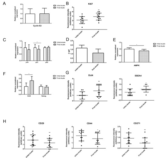 A high but variable expression was demonstrated for the mesenchymal markers CD29, CD44 [26] and CD271 [32] in hAFSCs. Interestingly, expression of these three mesenchymal markers was downregulated in the final eluted cells (Figure 2H and Figure S1).