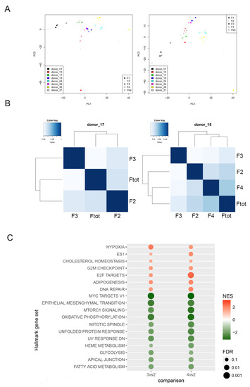 Principal Component Analysis (PCA) revealed that major variances tended to occur among donors, but differences were identified even between fractions from each population (Figure 3A). Furthermore, to emphasize these differences among fractions, Principal Component and Pearson correlation analyses were performed on each sample, individually. In particular, the Pearson coefficient was always less than 1, confirming successful isolation of diverse fractions from individual hAFSCs populations (Figure 3B).