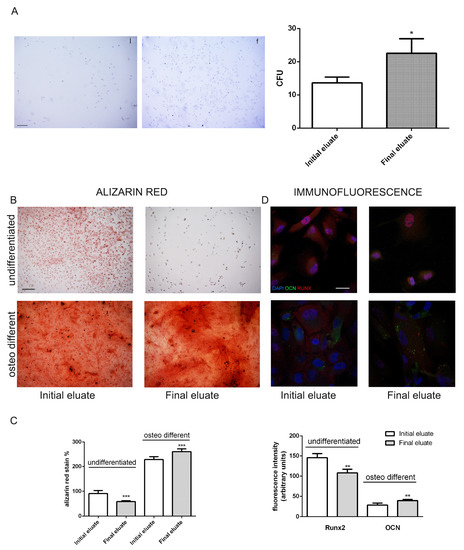 All these data suggested the higher stemness and plasticity of final eluted cells, corroborating the idea that an enlarged and more flattened morphology is typical of cells approaching cellular senescence and loss of plasticity [30].