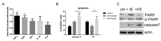 Analysis of the secretome produced by hAFSC fractions. (A) Graph representing ELISA tests for TGFβ, HGF, IDO, IL-10 and IL-6 analysed in condition medium (CM) produced by initial and final eluted cells obtained from 3 donors. The ratio between final and initial CM is shown. T test statistical analysis was performed to evaluate the difference between CM of final cells compared to the one of initial cells. * p value < 0.05; ** p value < 0.01. (B) Graph showing the percentage of PBMCs positive for Annexin V and PI after exposure for 4 days to CM produced by initial and final eluted cells. * p value < 0.05; ** p value < 0.01; **** p value < 0.0001. (C) Western blot analysis of lysates of PBMCs exposed to initial (IE) and final eluted (FE) hAFSCs revealed for PARP, caspase 7 and actin as loading control.