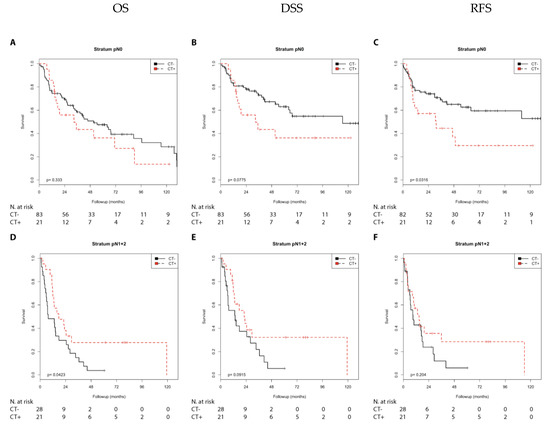 In summary, an unfavorable prognosis was detected in the N0 (RFS) and pT2 (DSS and RFS) groups treated with chemotherapy, whereas a favorable effect on prognosis was observed in the N1 + 2 (OS) group treated with chemotherapy.