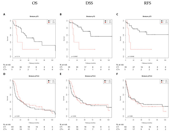 Kaplan–Meier analysis: Association of chemotherapy with prognosis (OS, DSS, and RFS) stratified by tumor stage (pT2 or pT3 + 4). In the pT2 group (A–C), chemotherapy was not associated with OS (A) but was associated with DSS (B; p = 0.010) and RFS (C; p = 0.005). In the pT3 + 4 group (D–F), chemotherapy was not associated with OS (D), DSS (E), or RFS (F).