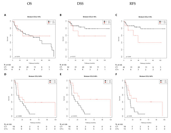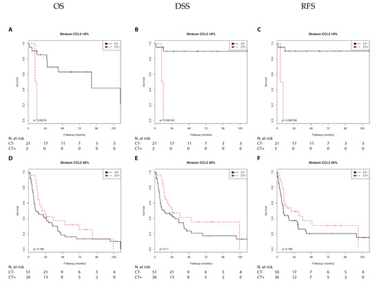 In addition, chemotherapy was associated with a shorter OS (RR = 11.56; p = 0.015), DSS (RR = 24.61; p = 0.009), and RFS (RR = 25.51; p = 0.009) compared with no chemotherapy in the pT2 group with positive CCL2 expression. Furthermore, chemotherapy was associated with a shorter RFS (RR = 2.52; p = 0.032) in the pT3 + 4 group with positive CCL2 expression (Table 3).