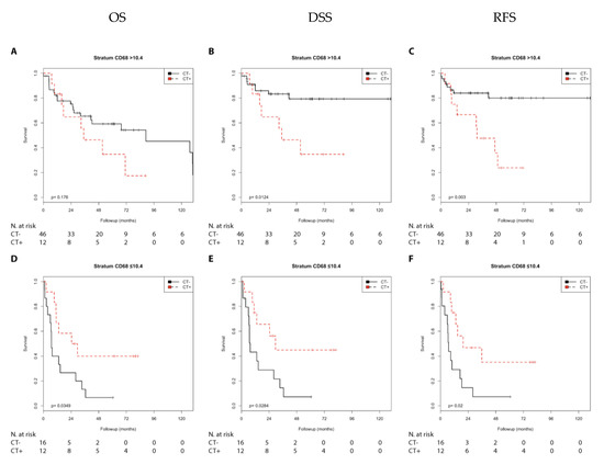 Chemotherapy was associated with a shorter OS (p = 0.042), DSS (p = 0.002), and RFS (p = 0.001) compared with no chemotherapy in the pT2 group with high CD68 expression. In addition, chemotherapy was associated with a shorter RFS (p = 0.027) in the pT3 + 4 group with high CD68 expression. In contrast, chemotherapy was associated with a longer OS (p = 0.044) and DSS (p = 0.048) and showed a trend with a longer RFS (p = 0.086) in the pT3 + 4 group with low CD68 expression (Supplementary Table S5; Figure 6)