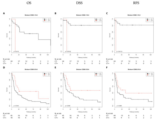 Kaplan–Meier analysis: Association of chemotherapy with prognosis (OS, DSS, and RFS) in the pT2/pT3 + 4 groups stratified by CD68 expression (>10.4 or ≤10.4). In the pT2 group (A–C) with CD68 (>10.4), chemotherapy was associated with shorter OS (A; p = 0.042), shorter DSS (B; p = 0.002), and shorter RFS (C; p = 0.001). In the pT3 + 4 group (D–F) at CD68 (≤10.4), chemotherapy was associated with longer OS (D; p = 0.044), longer DSS (E; p = 0.048), and as trend with longer RFS (F; p = 0.086).