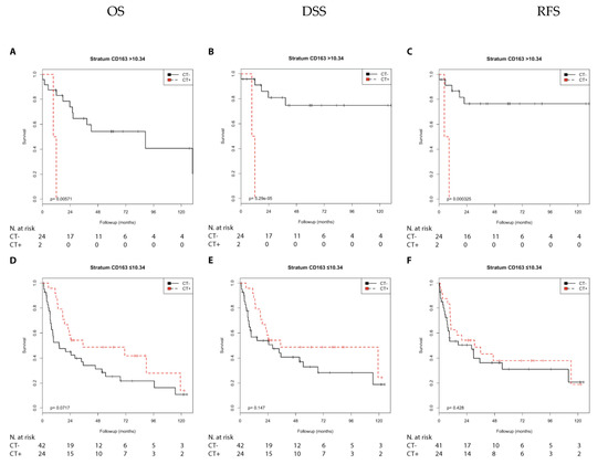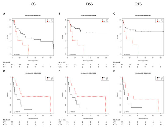 CD163 is an M2 macrophage marker, and M2 macrophages are considered to have antiapoptotic effects [20,22]. In the N1 + 2 group, high CD163 expression was significantly associated with a shorter OS (p = 0.016) compared with low CD163 expression and showed a trend with DSS (p = 0.086); however, no association was found in the N0 group [13].