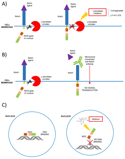 Mechanisms of Notch signaling inhibition as possible therapeutic strategies in hematological malignancies. (A) The inhibition of γ secretase-complex (i.e., with Crenigacestat or LY-411,575) prevents the proteolytic cleavage of Notch intracellular domain (NICD), blocking its signaling; (B) the binding with monoclonal humanized antibodies prevents Notch ligand interaction and the signaling activation; (C) gliotoxin is a specific Notch 2 inhibitor that binds Notch 2 intracellular domain (N2IC) blocking the DNA binding and preventing the target expression.