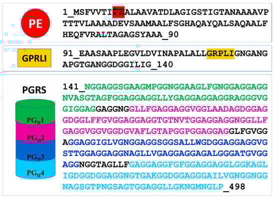 Knowing the three-dimensional structure of an antigen provides important insights into the understanding of the molecular nature of host–pathogen interactions and of the key epitopes that may serve as a target for the host antibody response. Although structural data on PE_PGRS proteins are not available, insightful information can be obtained by modeling techniques, learning from homologous proteins. Among PE_PGRS proteins, PE_PGRS33 is one of the best studied for its interaction with the immune system and has been considered a model for PE_PGRSs. As such, its putative role as a vaccine candidate is worth being investigated [81]. PE_PGRS33 is a large protein of 498 residues, with a modular architecture. A search in the PFAM database only identifies a PE domain at the N-terminal region of the protein, a small domain (residues 1–93) that is distributed nearly exclusively in actinobacteria, with only one exception for Tulasnella calospora, a genus of patch-forming fungi in the Tulasnellaceae family. A conserved linker GRLPI domain (l-GRPLI), likely acting as a transmembrane anchor, connects the PE domain to a distinctive region, not predicted by PFAM, and characterized by multiple repeats containing the GGA-GGX motif interspersed with unique sequences, and commonly denoted as PGRS domain (Figure 1).