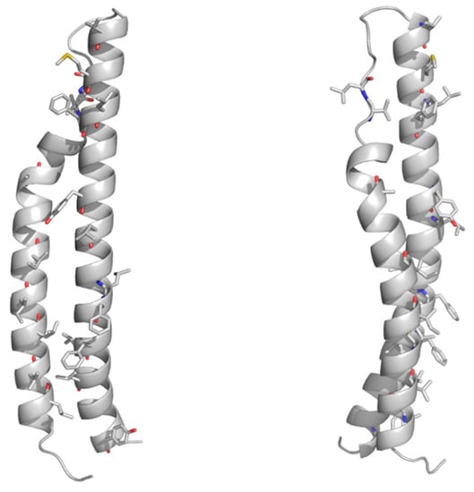 As mentioned above, no structural information on the PE domains from PE_PGRS proteins is hitherto known. Neither it is known whether PE_PGRS proteins strictly require a PPE-like domain, as in the case of PE proteins in Table 2. Here, we fill this structural gap by adopting homology modeling. The best template was identified by HHPRED as the PE domain the ESX-5-secreted PE8 (PDB code 5xsf, sequence identity 45.8%) and the homology model built using MODELLER [88,89,90,91]. As a result, the homology model of the PE domain of PE_PGRS33 shows that all hydrophobic/aromatic residues are located on one side of the molecule (Figure 3). This feature, also observed for the PE domains of PE/PPE complexes, suggests that either the PE domain of PE_PGRS33 forms homodimers or it is prone to interact with another protein to form a heterodimer. It is hitherto not clear whether PE_PGRS proteins require a protein partner [59,86], as in the case of PE/PPE proteins. Indeed, pe_pgrs genes are expressed as single operons. Also, the PE-unique LipY protein does not require a partner to be secreted [92]. These findings suggest that PE_PGRSs can be stable on their own, albeit being endowed with prone-to-interact PE domains for their functions.