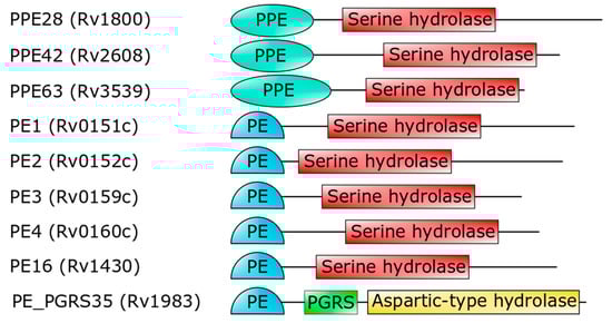 Domain architecture of PE- or PPE-containing Mtb proteins (strain H37Rv), which are predicted to embed a serine hydrolase domain [93]. The last hydrolase, PE_PGRS35, is the Mtb homolog of M. marinum PecA [92].