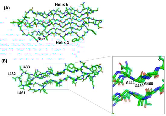 Stick representation of the homology model of the PGII sandwich domain PGII4, computed using the structure of sfAFP as a template (pdb code 2pne). The front view (A) shows the six PGII helices, whereas the side view (B) shows the localization of hydrophobic residues (e.g., L432, I433, L461) on the lateral loops. The inset shows glycine residues pointing inside and stabilizing the tightly packed PGII helices.