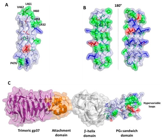 A comparison with the structure of the PE_PGRS33 PGII domains with that of the antifreeze protein sfAFP highlights different surface characteristics, albeit presenting the same fold, likely due to completely different functions of PGII domains in the two proteins (Figure 6). In PE_PGRS33, hydrophobic residues of PGII domains are located mainly on loop regions (Figure 5B and Figure 6A), likely accounting for a role of these residues in host recognition. Consistently, as will be shown later, removal of consecutive residues belonging to PGII domains of PE_PGRS33 (alleles from 48 to 52, Table 3) results in weaker immunostimulatory activity, in terms of reduced TNF-α [72,74]. By contrast, hydrophobic residues are mostly located on one side of the PGII structure of sfAFP (Figure 6B) [99]. The accumulation of hydrophobic residues on one side of the sandwich builds a module with one hydrophilic face and one hydrophobic face, and the flat hydrophobic face is supposed to interact tightly with the highly ordered water molecules found at the surface of an ice crystal [99]. In this respect, the flatness that characterizes this domain is functional for its tight association with the ice surface [99]. Interestingly, a PGII sandwich was also observed in the Salmonella bacteriophage S16 long tail fiber. In this case, this PGII sandwich domain plays a role in the interactions of the phage with its host, with its exposed (hydrophobic) loops being determinants of host binding. Therefore, similar to PGII of PE_PGRS33, the glycine-rich core of the PGII sandwich of S16 long tail fiber exposes hypervariable β-turn loops that determine receptor specificity (Figure 6C).