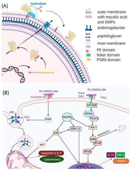 PE_PGRS33 promotes cell death and increases mycobacterial survival in macrophages, as demonstrated by heterologous expression in Mycobacterium smegmatis (Ms), in a process mainly governed by its PGRS domain [74,102,103]. Being localized on the outer surface of the Mtb cell wall, PE_PGRS33 is in a position that results in the exposure to the milieu and in the capacity to interact with the host [95] (Figure 7A). Consistently, PE_PGRS33 was shown to specifically interact with TLR-2 [71,74], though it remains to be determined whether TLR2 requires heterodimerization with TLR1 or TLR6 to properly bind PE_PGRS33, and the role of coreceptors as CD14 or CD36 as well.