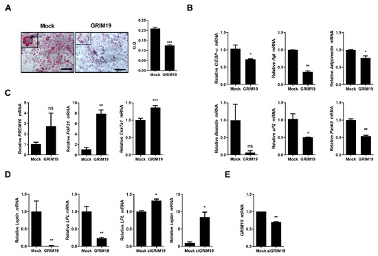Genes associated with retinoid-interferon-induced mortality 19 (GRIM19) regulates the transcript levels of genes associated with white adipose tissue (WAT) and brown adipose tissue (BAT). Scale bar, 100 µm. (A) Representative images of Oil Red O-stained 3T3-L1 cells. Mock and GRIM19-overexpressing 3T3-L1 cells were stained with Oil Red O. (B,C) Transcript levels of genes associated with WAT (B) and BAT (C) in 3T3-L1 cells expressing control plasmids (MOCK) and plasmids encoding GRIM19 (Grim19). (D) Transcript levels of leptin and lipoprotein lipase (LPL) in 3T3-L1 cells expressing control plasmids (MOCK), plasmids encoding GRIM19 (Grim19), or GRIM19-depleted siRNA (siGrim19). (E) GRIM19 mRNA levels were determined using real-time polymerase chain reaction. GAPDH was used as the internal control. Data are presented as the means ± standard deviations (SDs) of three independent experiments. * p < 0.05, ** p < 0.01, *** p < 0.001, and ns = not significant.