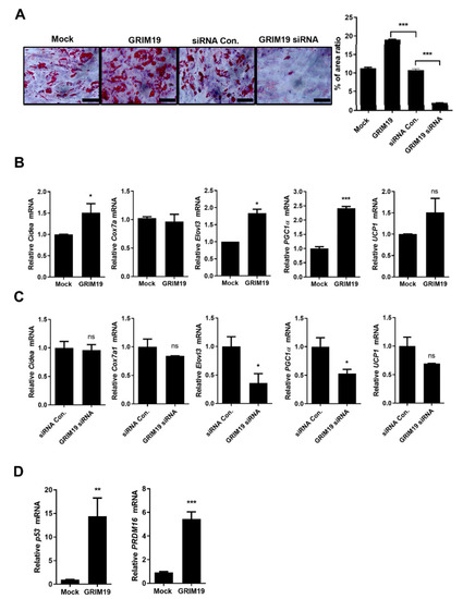 GRIM19 regulates BAT differentiation. (A) Representative images of Oil Red O-stained C2C12 cells. Mock, GRIM19-overexpressing, control siRNA (siRNA Con), or GRIM19 siRNA C2C12 cells were stained with Oil Red O. Scale bar, 100 µm. The bar graph shows averaged percentage of Oil Red O-stained area. (B) Transcript levels of cell death-inducing DNA fragmentation factor alpha-like effector A (Cidea), cytochrome C oxidase polypeptide 7A1 (Cox7a1), fatty acid elongase 3 (Elovl3), PGC1a, and UCP1 in mock-vector (MOCK) and GRIM19-overexpressing C2C12 cells. (C) Transcript levels of Cidea, Cox7a1, Elovl3, PGC1a, and UCP1 in control and GRIM19-depleted C2C12 cells. (D) Transcript levels of p53 and PRDM16 in mock-vector and GRIM19-overexpressing C2C12 cells. GAPDH was used as the internal control. Data are presented as the means ± SDs of three independent experiments. * p < 0.05, ** p < 0.01, *** p < 0.001, ns = not significant.