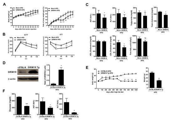 Overexpression of GRIM19 by two different strategies leads to the attenuation of high-fat diet (HFD)-induced obesity. (A) Kinetics of body weight changes (left) and rates of body weight gain (right) in HFD-fed control and GRIM19-administered mice over three independent experiments. (B) Glucose tolerance test (GTT, left) and insulin tolerance test (ITT, right) results for HFD-fed control and GRIM19-administered mice (n = 5). (C) Measurements of serum aspartate aminotransferase (AST), alanine aminotransferase (ALT), triglycerides, total cholesterol, high-density lipoprotein (HDL)-cholesterol, low-density lipoprotein (LDL)-cholesterol, and free fatty acid levels in HFD-fed control and GRIM19-administered mice (n = 5). (D) Splenocytes were obtained from wild-type (WT) and GRIM19-Tg mice. Cells were prepared to examine the expression of GRIM19. The bar graph shows relative intensity. (E) Kinetics of body weight changes in HFD-fed control and GRIM19-Tg mice. The bar graph shows the averaged body weights of HFD-fed WT and GRIM19-Tg mice at 10 weeks (n = 5–7). (F) Measurements of glucose, AST, and ALT levels in serum in HFD-fed control and GRIM19-Tg mice (n = 5–7). Data are presented as the means ± SDs. * p < 0.05, ** p < 0.01, *** p < 0.001, ns = not significant.