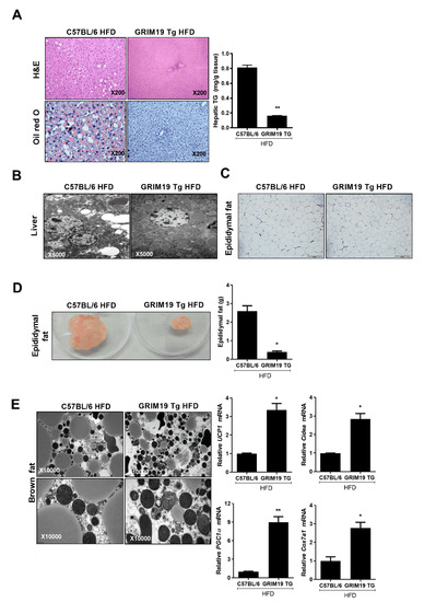 Abnormal liver function is related to the progression of obesity because obesity exacerbates the development of fatty liver [23]. GRIM19 ameliorates intracellular lipid accumulation by regulating the gene expression involved in fatty acid biosynthesis [24]. We conducted liver function experiments using serum from WT HFD and GRIM19-Tg HFD mice. The infiltration of immune cells into the liver and induction of fatty liver were attenuated in GRIM19-Tg HFD mice, compared with WT HFD mice. In addition, the production of hepatic triglycerides was reduced in the liver of GRIM19-Tg HFD mice, compared with the liver of WT HFD mice, as shown in Figure 4A. Electron microscopy revealed that lipid droplets were smaller in the liver of GRIM19-Tg HFD mice, as shown in Figure 4B. Histological analyses revealed smaller adipocytes in the epididymal fat of GRIM19-Tg HFD mice compared with WT mice, as shown in Figure 4C. The weight of epididymal fat was reduced in GRIM19-Tg HFD mice, compared with WT HFD mice, as shown in Figure 4D. Furthermore, lipid vesicles in the brown fat of GRIM19-Tg HFD mice were smaller. Compared with WT HFD mice, GRIM19-Tg HFD mice exhibited elevated expression levels of BAT-related genes, such as UCP1, Cristae, PGC1a, and Cox7a1, as shown in Figure 4E.
