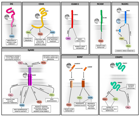 Since MMP-9 is a known modifier of the ECM [1,3,4], here we review the intracellular pathways and MMP-9 substrates that are involved in the activation of small Rho GTPases, thought to underlie ECM remodeling and synaptic plasticity. We focus on several well-described MMP-9 substrates in the central nervous system (CNS): DG (dystroglycan), CD44, ICAM-5 (intercellular adhesion molecule-5, also known as telencephalin/TLN), NLGN1 (neuroligin 1), BDNF (brain-derived neurotrophic factor), NCAM (neural cell adhesion molecule), EphB2 (ephrin type-B receptor 2), and CRMP2 (collapsin response mediator protein 2). We also discuss post-translational modifications of RhoGTPases that may play a key role in these processes.