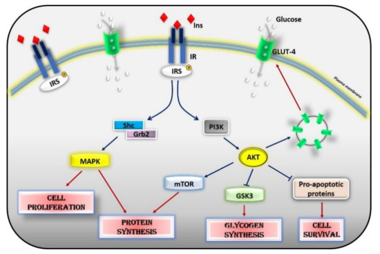 Glucose homeostasis is the result of a balance between glucose uptake in organs in the fed state (glycogen synthesis and glucose metabolism) and production of glucose by the liver during fasting (glycogenolysis and gluconeogenesis) and is under the control of a constellation of hormones, from insulin to glucagon, IGF-1, leptin, adiponectin, and adrenergic mechanisms. Insulin is the most potent regulator in the liver, muscle, and adipocytes. Insulin inhibits hepatic glucose output and enhances glucose uptake into skeletal muscle and adipose tissue. The insulin insensitive glucose transporter GLUT-2 in the liver and the insulin-sensitive transporter GLUT-4 in muscle and fat remove glucose from the bloodstream [2]. In muscle and adipose tissue, insulin acts by increasing the number of GLUT 4 at the plasma membrane to induce glucose transport [3,4]. In the liver, the number of GLUT-2 does not change in response to insulin, which in turn regulates the enzymes needed for maintaining glucose cellular disposal [4]. At the molecular level, insulin activates a specific tyrosine kinase receptor, the insulin receptor (IR). Insulin binding to its receptor activates its intrinsic tyrosine kinase activity (Figure 2). IR phosphorylates different substrate adaptors (IRS) in tyrosine residues that form binding sites for intracellular molecules that contain Src-homology 2 (SH2) domains [5,6]. IRS proteins are a family of adaptor proteins whose main role is to convert the tyrosine phosphorylation signal into a lipid kinase signal [5,6]. PI3K is the main active mediator of insulin effects, via the activation of the AKT/PKB cascades. Activated AKT induces glycogen synthesis through inhibition of GSK-3, protein synthesis via mTOR signaling, cell survival through inhibition of several pro-apoptotic agents, and autophagy by inhibiting FoxO transcription factors. AKT also regulates the translocation of the insulin-sensitive glucose transporter GLUT-4 to the cell membrane within muscle and fat cells for the extraction of glucose [5]. Insulin also acts through the mitogen-activated protein kinase (MAPK) pathway, by phosphorylating the IRS proteins, Gab1, and Shc [7]. The activation of the MAPK cascade is associated with the proliferative effects of insulin [7,8].