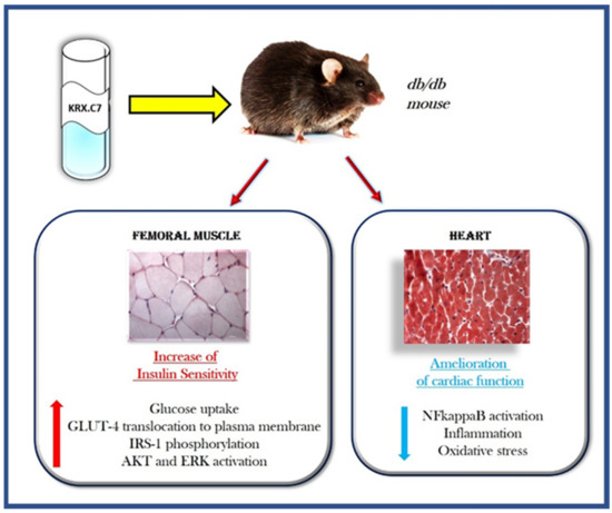 The double effect of GRK2 inhibition in diabetic mice. In db/db mice, the treatment with KRX-C7, a selective inhibitor of GRK2, increases insulin sensitivity by affecting the insulin signaling cascade. Indeed, it induces the phosphorylation of IRS-1 and the activation of AKT and MAPK signaling. This induces the translocation of GLUT-4 to the plasma membrane and increases glucose uptake. Abbreviations: KRX-C7 = cyclic peptide inhibitor of GRK2; GLUT4 = Glucose Transporter type 4; IRS = Insulin Receptor Substrate; AKT = Protein kinase B; ERK = Extracellular signal-Regulated Kinase; NFkappaB = Nuclear Factor kappa-light-chain-enhancer of activated B cells.