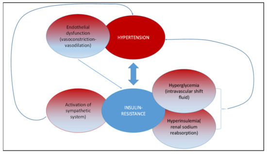 Several studies reported that hypertension and insulin resistance are strictly connected [68,69,70,71,72]. Insulin resistance is a pathological condition in which target tissues fail to respond to insulin stimulation, leading to hyperglycemia and compensative hyperinsulinemia [73]. Hyperglycemia acts on electrolytic balance, driving a fluid shift from the intracellular to the extracellular compartment. The body water and solutes redistribution lead to plasma volume expansion and blood pressure (BP) elevation [74]. Hyperinsulinemia directly elevates BP via several mechanisms: increased renal sodium reabsorption, activation of the sympathetic nervous system, alteration of transmembrane ion transport, and hypertrophy of resistance vessels. Hypertension and insulin resistance represent the main actors of metabolic syndrome, a complex and multifactorial disease, also including obesity, glucose intolerance, and dyslipidemia, which lead to a dramatic increase in cardiovascular morbidity and mortality [75,76,77]. A complex network of different factors has been proposed to explain the underlying mechanisms for the development of hypertension in the metabolic syndrome, including: visceral/central obesity, insulin resistance, sympathetic overactivity [78], oxidative stress, endothelial dysfunction, and activated renin-angiotensin system [79,80] (Figure 4).