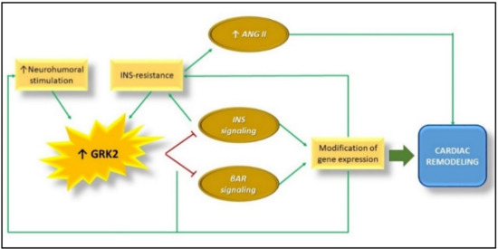 GRK2 up-regulation, Insulin resistance, and maladaptive cardiac remodeling in heart failure. Several studies showed that myocardial GRK2 activity and expression is increased in the failing heart. This promotes desensitization and downregulation of βAR and inhibits INS signaling, causing the modification of hypertrophic gene expression and, consequently, cardiac remodeling. The alterations of INS signaling cause Insulin resistance that in turn induces Ang II-dependent cardiac remodeling. Abbreviations: GRK2 = G Protein coupled Receptor Kinase type 2; βAR = beta adrenergic receptor; INS = Insulin; ANG II = Angiotensin II.