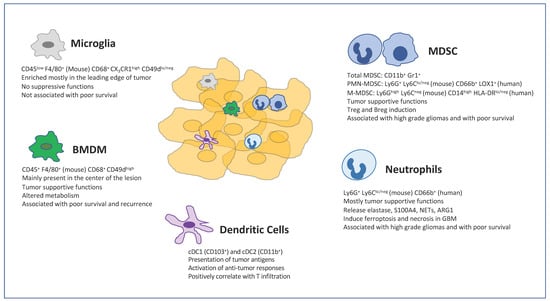 Histopathological, flow, and mass cytometry, single cell RNA sequencing analyses in human and rodent experimental gliomas reveal an extensive heterogeneity of immune cells infiltrating glioma microenvironments [10,11,12,13]. The majority of immune cells in gliomas, including GBM, comprises a vast diversity of myeloid cells, which include bone marrow-derived macrophages (BMDMs), microglia, myeloid-derived suppressor cells (MDSCs), dendritic cells and neutrophils.