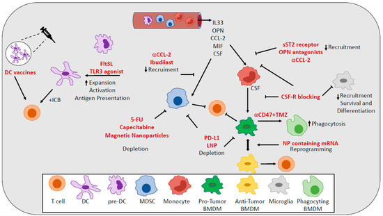 Targeting myeloid cells in GBM. Different approaches aimed to deplete and to inhibit functions and recruitment of MDSCs and TAMs are used to reduce the immunosuppression. DC vaccines and approaches aimed to increase accumulation, activation, and functions of DCs are used to stimulate effector functions.