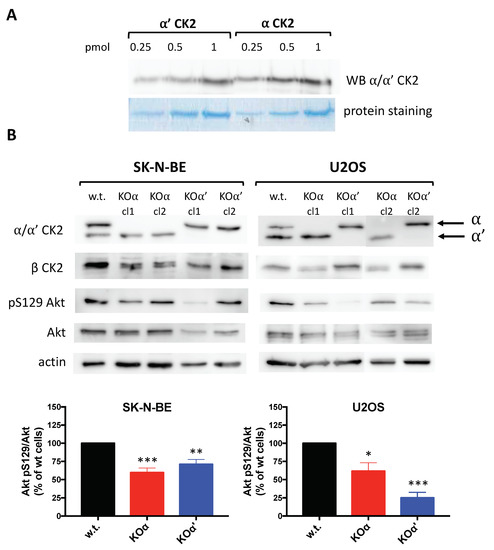 CK2 expression and activity in SK-N-BE and U2OS cells. (A) Titration of the antibody reactivity towards CK2 catalytic subunits. The indicated amounts of recombinant CK2 catalytic subunits (myc-α’ or α) were loaded on SDS-PAGE, and either blotted for the WB (western blot) analysis or stained by Colloidal Coomassie Blue; (B) CK2 expression and activity in w.t. and KO clones of the cells used for this study. 10 μg proteins from cell lysates were analyzed by WB with the indicated antibodies. The last two right lanes belong to an independent experiment. As a reporter of CK2 endogenous activity, pS129 Akt signal has been quantified, normalized to total Akt signal, and reported in the bar graph as % of w.t. cells. At least three independent experiments were performed; representative western blots are shown, while quantification in the bar graphs reports the mean values ± SEM of all experiments and of the two clones of the same KO. Statistical significance refers to w.t. cells. (*) p < 0.05, (**) p < 0.01, (***) p < 0.001