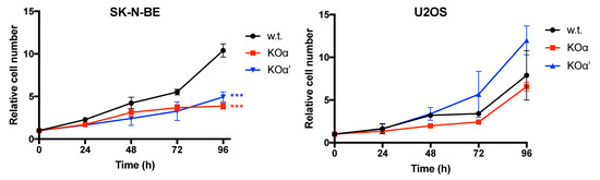 In SK-N-BE neuroblastoma cells, both α and α’ KO displayed a slower proliferation compared to w.t. cells (Figure 2). Results were less clear for the U2OS osteosarcoma model: the U2OS KOα’ cells were more proliferative than the w.t. cells, while KOα were quite similar to w.t. (Figure 2).