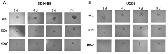 Spheroid formation potential of w.t. and KO clones of (A) SK-N-BE cells, and (B) U2OS cells were seeded in a 96-well plate precoated with 50 μL of 1% agar (see Section 2). Inverted microscope images taken at the indicated times (d = days) are shown. At least two separate experiments were performed, in quadruplicates. Representative images (SK-N-BE KOα clone 1, KOα’ clone 1; U2OS KOα clone 2, KOα’ clone 1) are shown.
