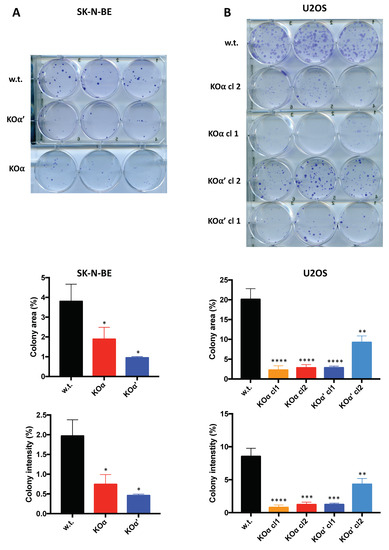 Clonogenic potential of w.t. and KO clones. (A) 250 SK-N-BE cells/well (w.t. or KOα clone 1, or KOα’ clone 1), or (B) 100 U2OS cells/well (w.t. or clones as indicated) were plated, then grown for 15 days. Colonies were stained with Crystal violet, and images were taken by a scanner device at day 15. At least two separate experiments in triplicate were performed; three representative images are shown for each clone. The bar graphs on the bottom show the quantification of the area covered by colonies (upper graph) and the colony intensity percentage (lower graph), which is related to the number of cells in a colony (mean values ± SEM). Significance refers to w.t. cells. (*) p < 0.05, (**) p < 0.01, (***) p < 0.001, (****) p < 0.0001.