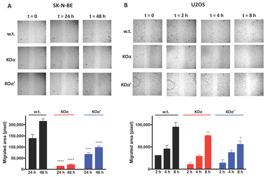 Migration of w.t. and KO clones of (A) SK-N-BE (KOα clone 1, KOα’ clone 1) and (B) U2OS (KOα clone 1, KOα’ clone 2) cells. Cell migration was assessed by wound-healing assay. Images were taken at the indicated times after the removal of the insert (t = 0). The experiments were performed three times. Representative images are shown. The bar graphs on the bottom show the quantification of the migrated areas of at least 2 different experiments, each one performed in triplicates (see Section 2 for details). Significance refers to the corresponding time in w.t. cells. (*) p < 0.05, (***) p < 0.001, (****) p < 0.0001.