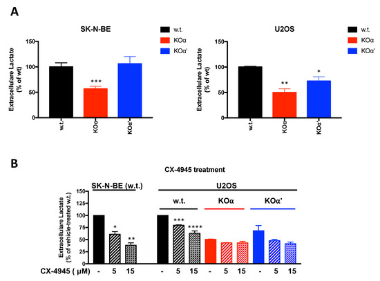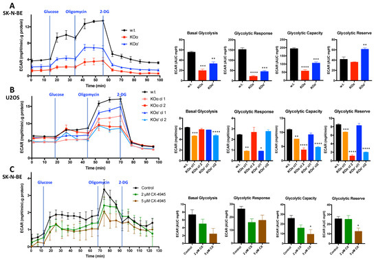 Seahorse glycolytic stress test of w.t. and KO clones of SK-N-BE and U2OS cells. The glycolysis stress tests were performed using a Seahorse extracellular flux analyzer. ECAR (extracellular acidification rate) was monitored following the indicated additions and normalized to protein concentrations. Each experiment was performed at least in quadruplicate. Values are expressed as the mean ± SEM. At least two independent experiments were performed; representative profiles are shown. (A) SK-N-BE cells glycolytic stress test profile (left) (KOα clone 1, KOα’ clone 2) and quantification of the experiment (right), performed with the XF software. ECAR values are expressed in AUC (Area Under Curves) units, quantifying the area of the curves corresponding to the different phases of the experiment (see Section 2). Significance refers to w.t. cells; (B) U2OS cells glycolytic stress test profile (left) (w.t. cells or the indicated clones) and quantification of the experiment (right), performed with the Wave software. ECAR values are expressed in mpH/min, as detected at the last measure point of each phase of the experiment (see Section 2). Significance refers to w.t. cells; (C) SK-N-BE cells glycolytic stress test profile, upon treatment with vehicle (control) or the indicated concentration of CX-4945 for 5 h before running the Seahorse experiment (left). Quantification of the experiment is shown on the right, performed with the XF software. ECAR values are expressed in AUC (Area Under Curves) units, quantifying the area of the curves under three points of each phases of the experiment (see Section 2). Significance refers to vehicle-treated control cells. (*) p < 0.05, (**) p < 0.01, and (***) p < 0.001, (****) p < 0.0001.