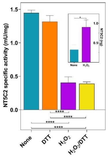In order to adapt to an altered redox status, cancer cells often exhibit an increased antioxidant capacity [33]. We used an astrocytoma cell line, ADF, whose capacity to counteract oxidative stress conditions has been previously reported [34], to evaluate whether the NT5C2 activity is susceptible to oxidative stress conditions. The ADF cells were subjected to H2O2 treatment, and the phosphotransferase activity of NT5C2 was measured in the cell lysates. The oxidative conditions caused a significant loss of enzyme activity (1.45 ± 0.04 mU/mg vs. 0.41 ± 0.09 mU/mg), and the effect was not reversed by the addition of DTT in the assay mixture (Figure 2). Despite the loss of activity, the ELISA test demonstrated that the concentration of the enzyme increased in cells exposed to H2O2 (Figure 2, inset), indicating that the decrease of activity is not related to a loss of the protein but, rather, to the protein modification.